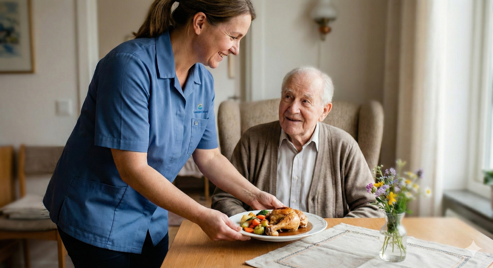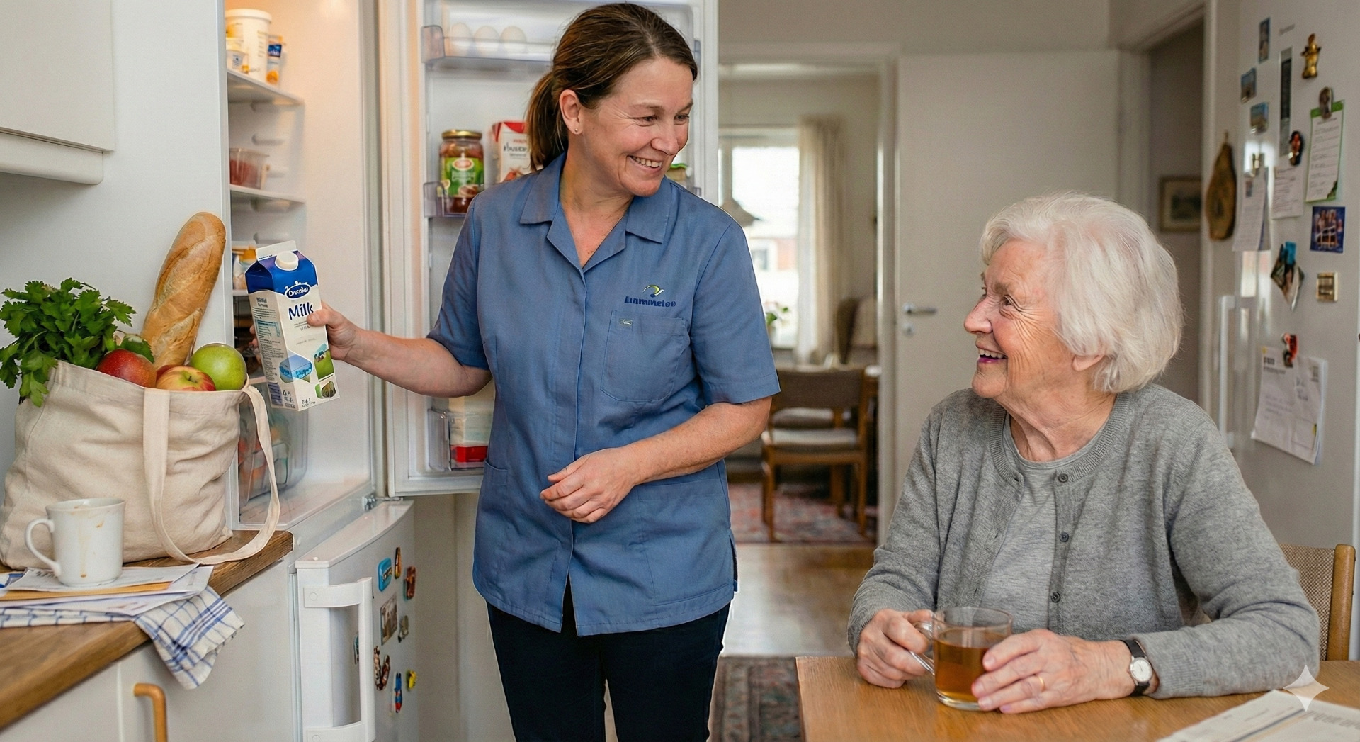 Pokud potřebujete více péče, o nic se nestaráte. Pečovatelky vám oběd nejen přinesou, ale i ohřejí a naservírují přímo na stůl. Stejně tak vám ve vaší kuchyni připraví snídani či večeři z vašich zásob. I nákupy vyřešíme kompletně za vás – nejen že nakoupíme, ale potraviny vám i rovnou uložíme do lednice a spíže.